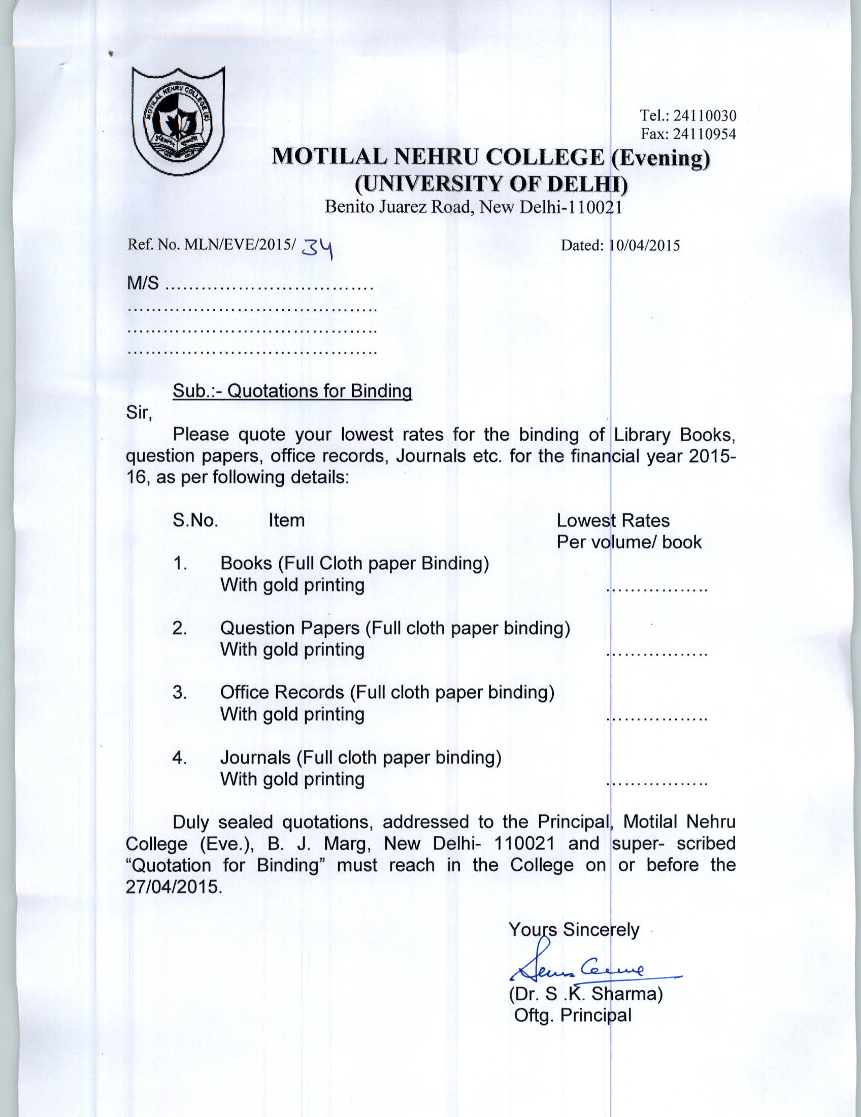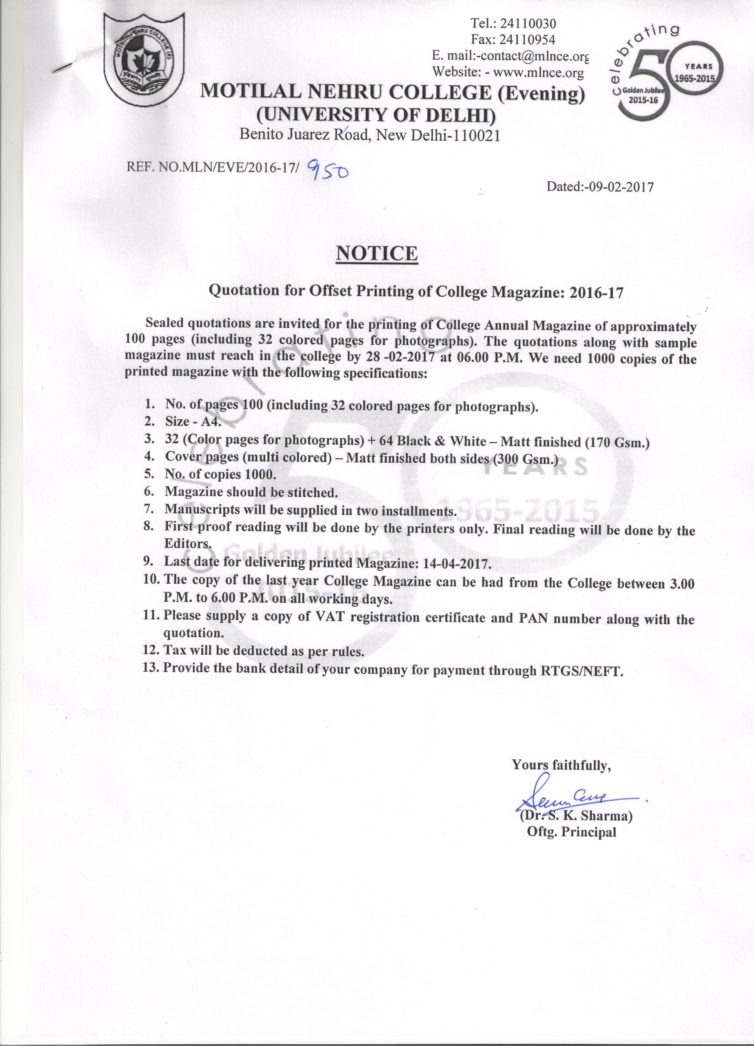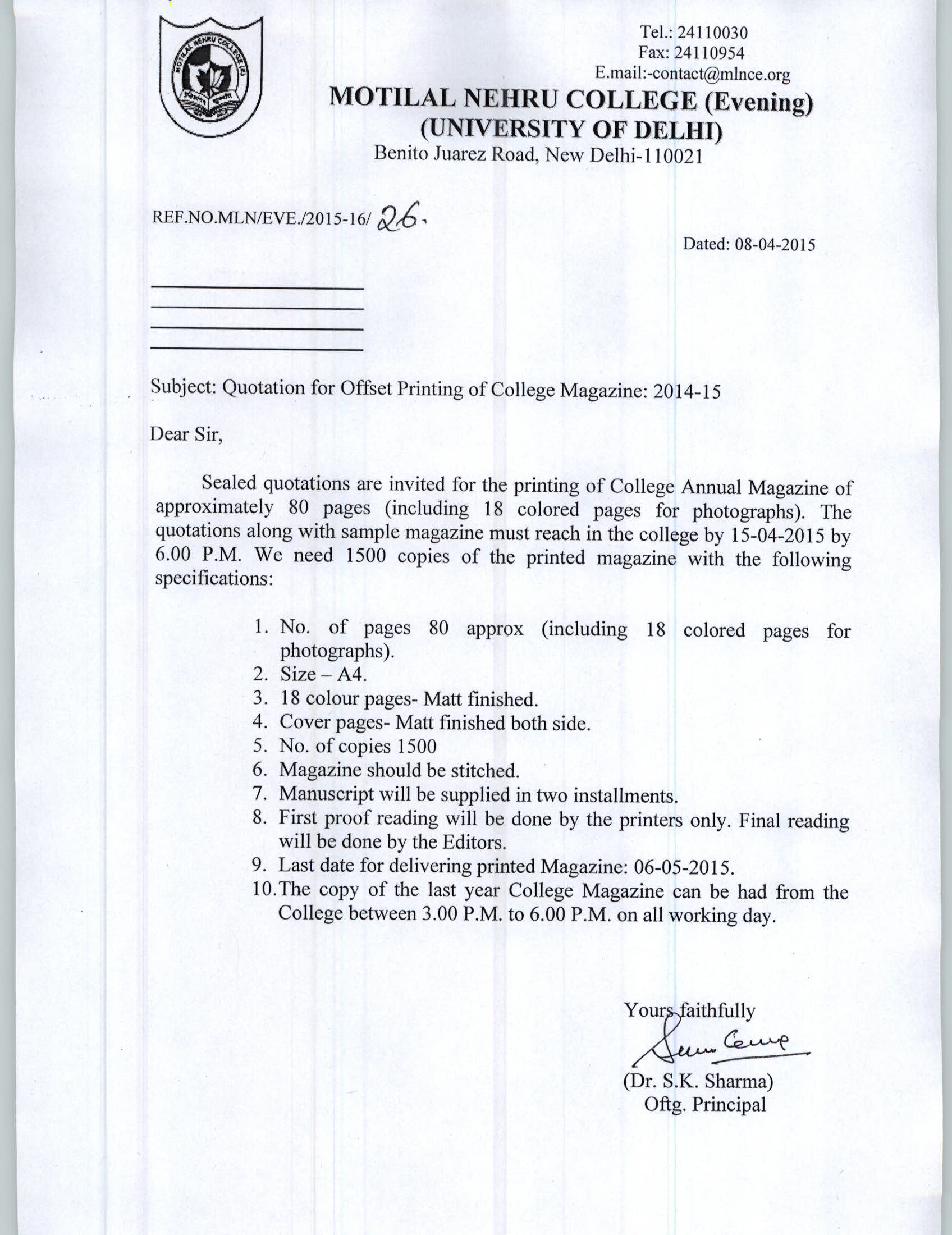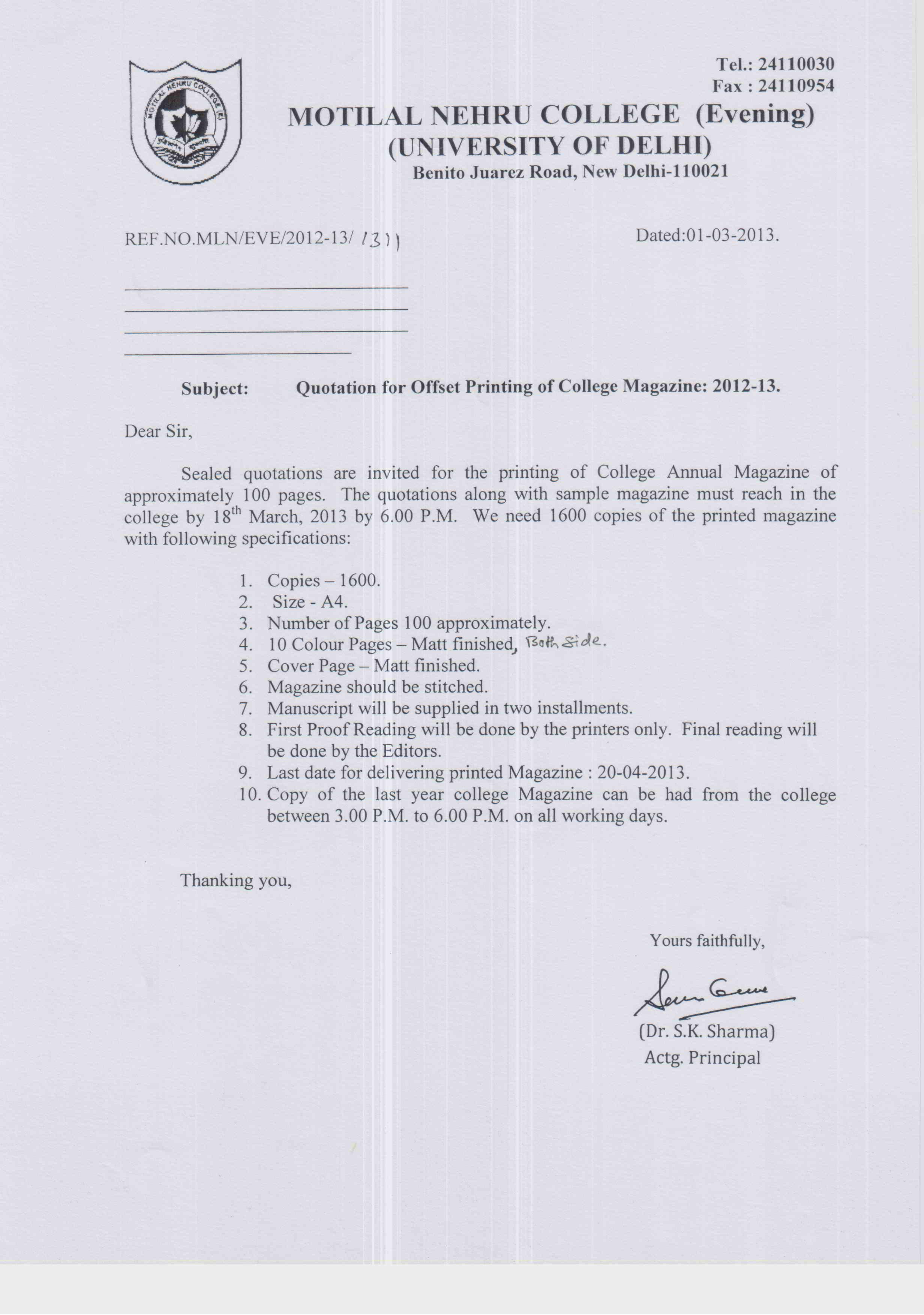 Tender Notice regarding Offset Printing of College Magazine 2012-13.